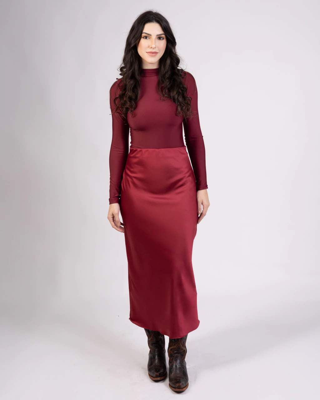 Modelo: Saia midi com corte reto e fluido, em tecido cetim.